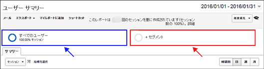 まずレポート画面の上部にある「+セグメント」(図1赤枠部分)のエリアをクリックしよう。ブラウザ表示の横幅が狭い場合は、「すべてのユーザー」(図1青枠部分)の下に並んで表示される。