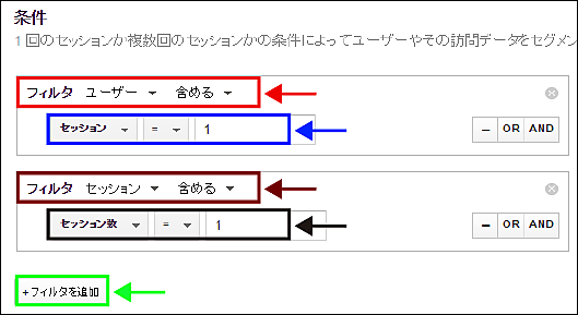 そして、2つ目の条件はセッションベースのフィルタを掛けたいので、まず「+フィルタを追加」(図4緑枠部分)をクリックし、「フィルタ」「セッション」「含める」と指定し(図4茶枠部分)、セッションベースのセグメントにしたうえで、「セッション数」「=」「1」とする(図4黒枠部分)。この「セッション数」は先ほどの「セッション」とは異なり、累計訪問回数を意味するディメンションで、これを「1」とすれば、初回訪問を指定したことになる。