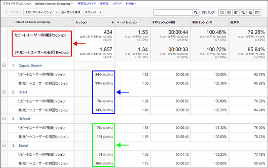 この例では、リピートしなかったユーザーはソーシャルメディアからの訪問だったということで、「たまたまソーシャルで面白おかしく取り上げられたりしたのをきっかけに訪問したユーザーが、一見さんだったのかもしれない」といった仮説を立てることができそうだ。