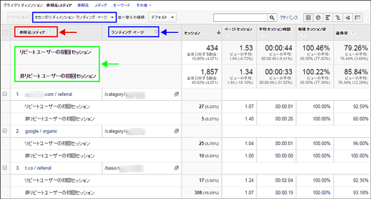 図8は[集客]>[すべてのトラフィック]>[参照元/メディア]レポート(図8赤枠部分)で「セカンダリ ディメンション」に「ランディング ページ」を指定(図8青枠部分)したうえで、該当の2つのセグメントを掛けた(図8緑枠部分)ものだ。こうすることで、図6の「チャネル」より粒度が細かいので、もっと詳しい傾向や違いを確認することができる。