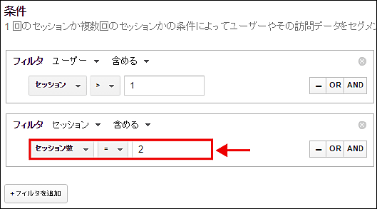 2回目の訪問セッションを指定する部分が変わるだけなので、図4の指定と異なる部分は、最後の「セッション数」「=」「2」(図9赤枠部分)だけだ。
