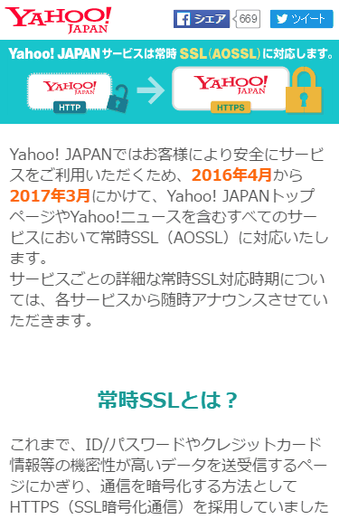 ヤフーは、2016年4月から2017年3月にかけて、運営するすべてのサービスを常時HTTPS(SSL)化することをアナウンスした。