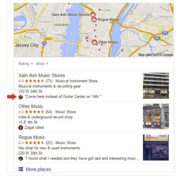 レビュー付きのパック結果は、“music stores nyc”のクエリで出てきたそうだが、もう出ていないらしい。筆者も再現できなかった。