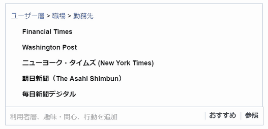 ここで僕が取り上げたいのはFacebookで、そのターゲット設定オプションの数にはちょっとびっくりさせられる。とはいえ、僕たちにとっては役に立つ機能であることは確かだ。たとえば、次のようなオプションを使って対象とするジャーナリストを細かく設定できる。