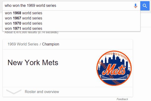たとえば、以下に示したグーグルの「フィーチャード・スニペット」機能は、「1969年のワールドシリーズを制したのはどのチームか?」といったシンプルな質問に対し、検索結果ですばやく回答を提示する手段となっている。