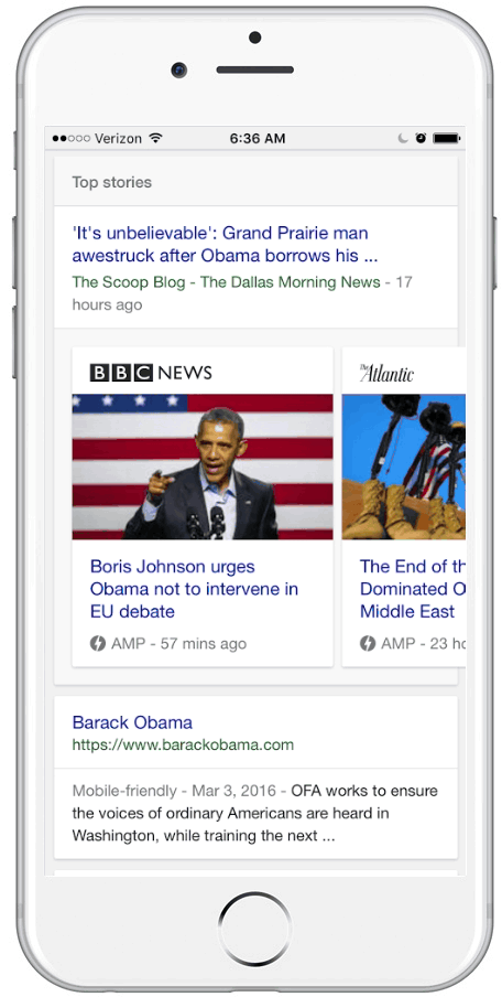 AMPコンテンツには、グーグル検索の上部(つまりスクロールしなくても目に入る場所)に表示されるという利点があり、グーグルが今後、すべてのAMPの検索結果でこの表示方針や表示の仕方を変更しない限り、その利点は変わらない。以下は、検索結果でAMPページがどのように表示されるかを示す例だ。