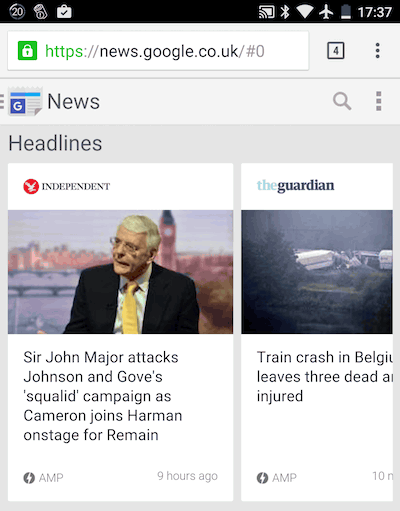 グーグルは、GoogleニュースでのAMP対応カルーセルの表示を、2016年4月に米国で始めていた。今回新たに、フランス・ドイツ・イタリア・イギリス・ロシア・メキシコの6か国のGoogleニュースでAMPサポートを開始した(ウェブ検索の検索結果ではなく、GoogleニュースでのAMPカルーセル表示)。
