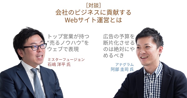 売上への貢献を意識したWeb戦略を提唱するミスターフュージョンの石嶋洋平氏と、運用型広告のスペシャリストであるアナグラムの阿部圭司氏。多くのクライアント企業を客観的に見て業績改善を支援し、かつ自身も経営者である両氏が共通して感じるのは、「Web担当者はもっと会社のビジネスを意識すべき」ということ。