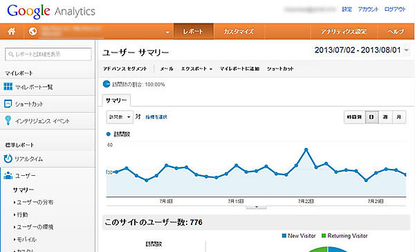 カスタマイズをしていなければ、最初に開く画面は「ユーザーサマリー」だと思います。開かない方は、左側のメニューの[ユーザー]をクリックして開き、[サマリー]をクリックします。ユーザーサマリーは、「ホームページにどんな人がアクセスしているのか」という視点で集計されたレポートです。