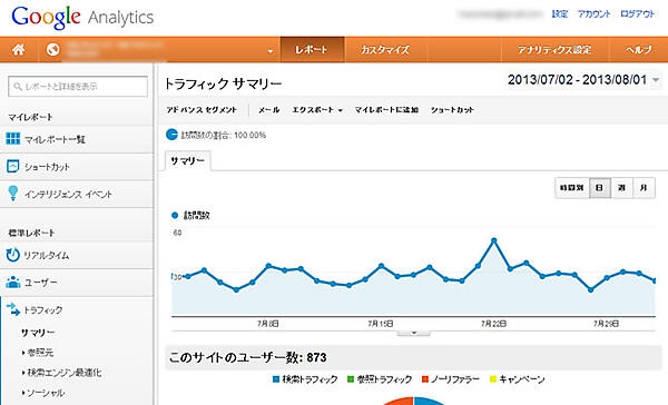 左側のメニューの[トラフィック](※Web担編注:現在は[集客])をクリックして開き、[サマリー]をクリックすると表示されます。トラフィックサマリー(※Web担編注:現在は「集客サマリー」)は、「どこからホームページにきたのか」という視点で集計されたレポートです。