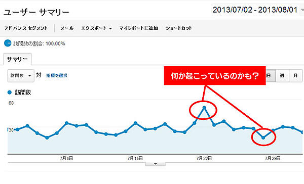 アクセス解析でまず大事なのは傾向をつかむことです。「今日はアクセス数が100だった」といった具体的な数字で一喜一憂するよりも、全体の傾向から「今日はいつもより多いな、どうしたんだろう?」という疑問を持つことが大切です。