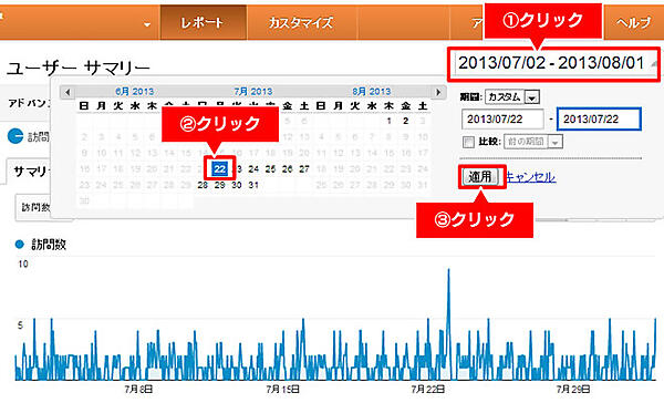 時間帯別のグラフはグラフ右上の「時間別」をクリックすると見られるのですが、このままクリックするととても細かなグラフになって見づらいので、「対象期間」を変更してみましょう。画面右上の期間が表示されている部分をクリックして[1]カレンダーを表示し、見たい日付をクリックして[2]「適用」ボタンをクリックします[3]。