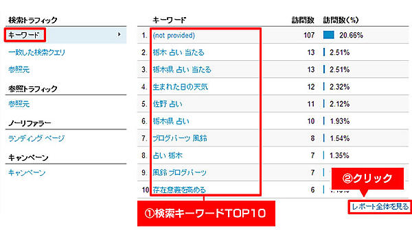 検索キーワードは「トラフィックサマリー」のページの下のほうにある[検索トラフィック]の[キーワード]から見ることができます[1]。サマリーではトップ10が表示されていますが、すべてのキーワードを見る場合は[レポート全体を見る]をクリックします[2]。自分が想像していないようなキーワードもあるかもしれませんので、じっくりチェックしましょう!ちなみにこの例では占いに関するブログ記事にアクセスが集中していることがわかります。