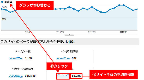 まず、ホームページ全体の平均直帰率を「コンテンツサマリー」(※Web担編注:現在は「サマリー(行動サマリー)」)で見てみましょう。グラフの下に小さく数字が載っています[1]。数字の横の小さなグラフのような画像をクリックすると、上のグラフに日ごとの変化のグラフを表示できます[2]。