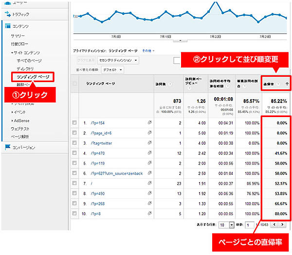 さらに、「直帰」されてしまったページは具体的にどれなのかを調べてみましょう。左のメニューから[コンテンツ](※Web担編注:現在は[行動])を開き、さらに[サイトコンテンツ]を開いて[ランディングページ]をクリックします[1]。すると、ホームページにアクセスしたときに最初に開いたページの一覧が訪問数順に表示されます。ここの一番右の[直帰率]という表見出しをクリックすると、直帰率が高い順に並びます[2]。もう一度クリックすると低い順になります。