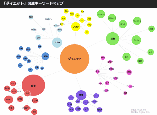 また、円の大きさは検索数を表しています。「ダイエット」から直接つながっている「食事」「運動」などでは、該当クラスタの総検索数になっています。