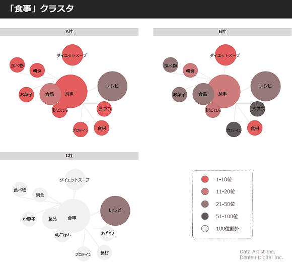 表1のように、各クラスタには数百キーワードが属して、図2では検索数の上位10件までのキーワードを描画しています。