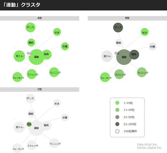 「運動」においても3社の傾向は大きく変わらず、A社が幅広いキーワードで上位表示されていることがわかります。