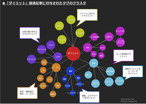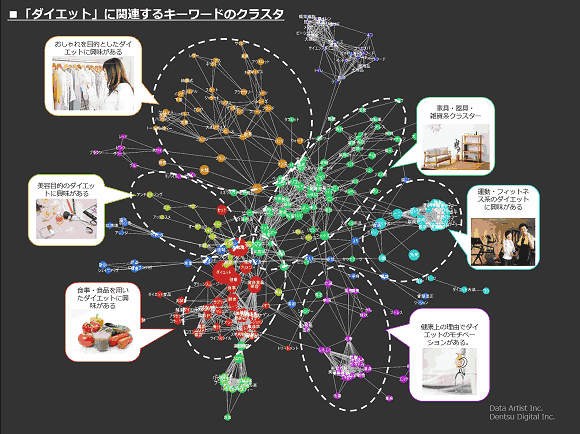 先ほど抽出した「食事」や「運動」クラスタのなかにも、「食事」であれば「お茶」や「サプリ」よりも直接的な「健康食品」の方が「ダイエット」につながるなども、実際の運用面ではおさえていきたいところです。