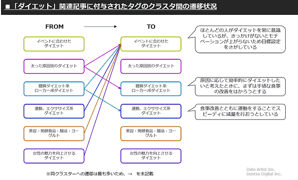 図7のように、「ダイエット」に関する記事でも、「クリスマス」のようなイベント軸で語っている記事や、「くびれ」などの体の部位に関する記事など多様にあります。それらをクラスタリングしたものから、クラスタ間の遷移状況を取得したのが表3です。