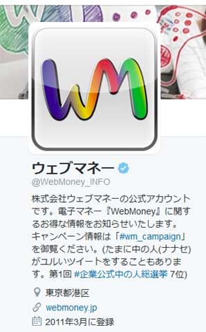 ゆるいツイートを織り交ぜながら、独特なキャラクターでコミュニケーションするのは、電子マネー「WebMoney」を発行するウェブマネーの公式Twitterアカウント。