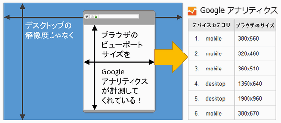 これまで、アクセス解析ツールは「デスクトップ画面のサイズ(解像度)」を取得していることが多かったのですが、「ブラウザのサイズ(ビューポートサイズ)」を取得しているツールはさほど多くありませんでした。