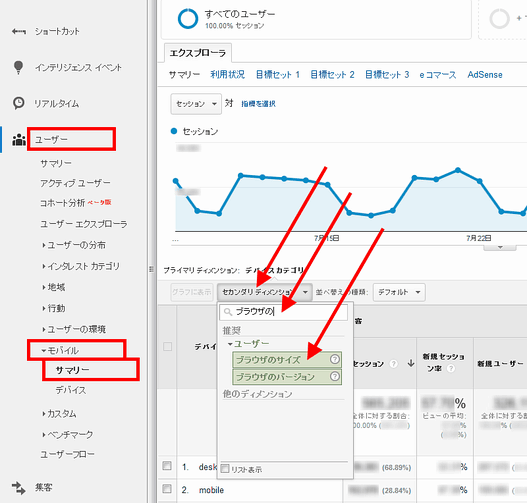 Googleアナリティクスのレポートで、[ユーザー]>[モバイル]>[サマリー]を選んでください。