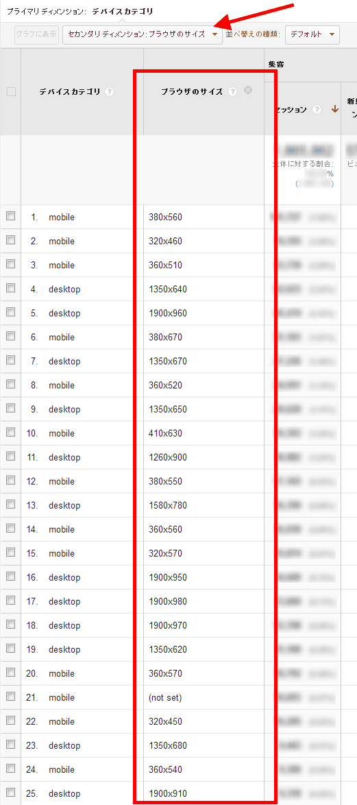 すると、表の2つ目のカラムとして「ブラウザのサイズ」が表示されます。これは「ブラウザのウィンドウのサイズ」ではなく、「ブラウザの表示領域のサイズ」であることが、ポップアップのヘルプにも示されています。