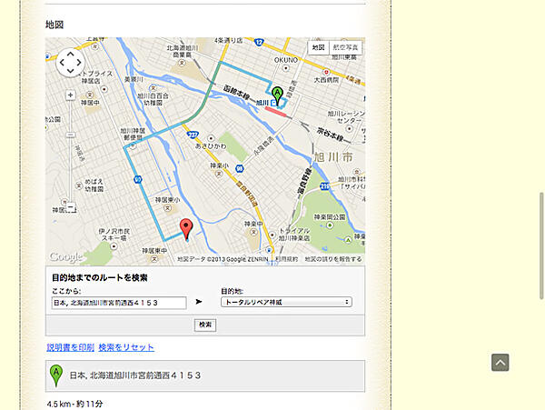 現在地から目的地までのルートを表示したところ。みんビズの編集画面で、「地図の高さ 400」という部分のすぐ左側のボタン(コンパスのボタン)をオンにすることで、ルート表示機能が有効になる(初期状態ではオンです)。