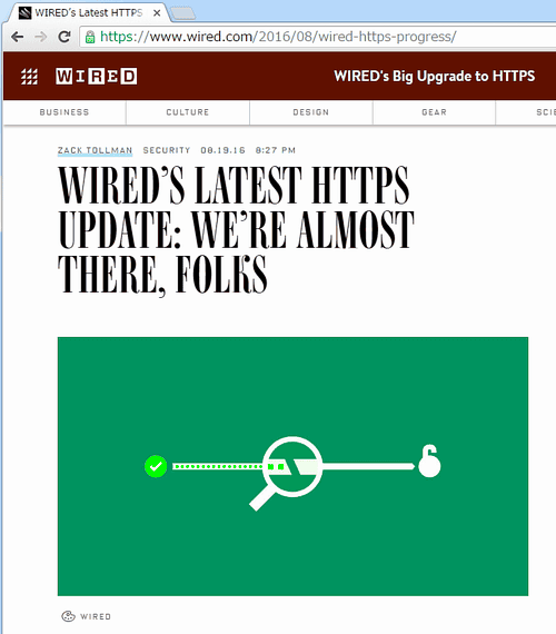 大手メディアサイトのワイアード(WIRED)は、今年の4月に常時HTTPS化に着手した。4か月後の状況を報告している。2つの問題点が依然として残っているそうだ。