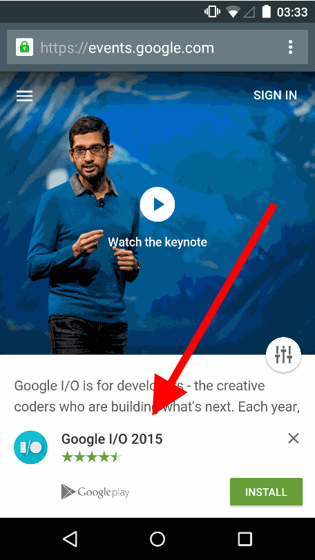 画面スペースから見て妥当な大きさで、簡単に閉じることのできるバナー。ここで言う妥当な大きさとは、たとえば Safari や Chrome に表示されるアプリ インストール バナー程度の大きさです。
