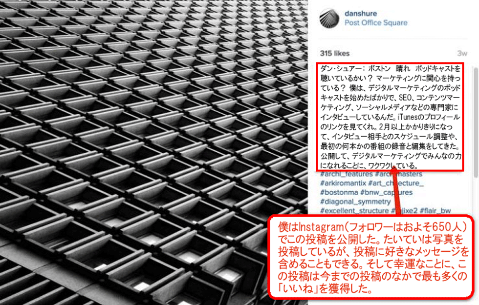 僕は、いつものように写真をシェアするだけでなく、投稿メッセージでポッドキャストを告知すればいいんじゃないかと考えた。