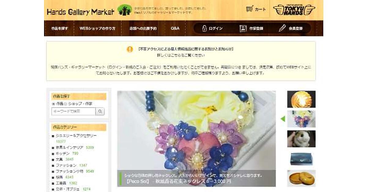 東急ハンズは9月30日、手作り作品のECサイト「ハンズ・ギャラリー マーケット」が第三者による不正アクセスを受け、クレジットカード決済を利用した顧客の情報など861件が漏えいした可能性があると発表した。