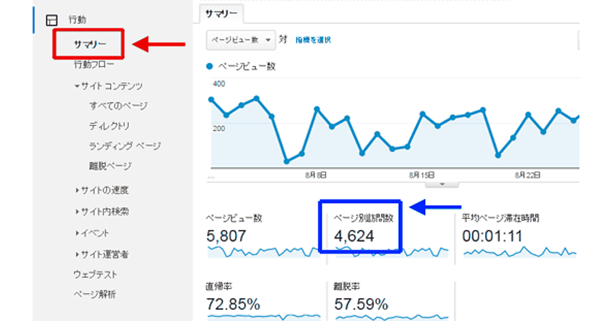 では、この「ページ別訪問数」はどのレポートで見ることができるのだろうか? 「ページ別訪問数」は、行動系のレポートで確認できる。たとえば[行動]>[サイト コンテンツ]>[すべてのページ]レポート(図1赤枠部分)や[行動]>[サマリー]レポート(図2赤枠部分)などだ。