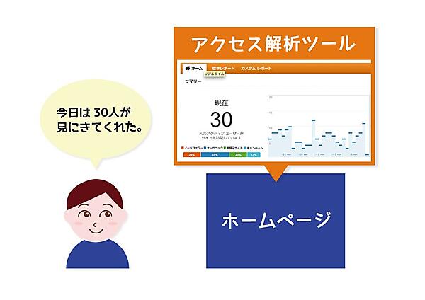 店頭では、接客や売り上げの集計、アンケートなどを行うことで、お客さまの情報を知ることができますが、ホームページでは、Google アナリティクスなどのアクセス解析ツールを使うことで、