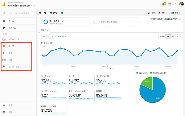 赤い枠の中が、基本のメニューです。「ユーザー」の中にある、「ユーザーサマリー」というレポートページが表示されています。