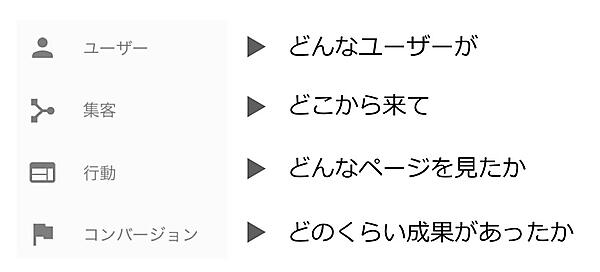 ざっくり言うと、「どんなユーザーが」「どこから来て」「どんなページを見たか」「どのくらい成果があったか」を知ることができます。