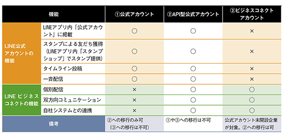 「API型公式アカウント」は従来の公式アカウント(①)とビジネスコネクトの両方の特徴を備えたタイプです。すでに公式アカウントを持っている企業がビジネスコネクトを開始する場合は、このアカウントタイプでの運用になります。一方で「ビジネスコネクトアカウント」は、ビジネスコネクトの機能に特化したアカウントタイプで、公式アカウントを持たない企業が新たにビジネスコネクトを実施する場合に限り選択可能です。一斉配信やLINE内のスタンプショップ経由での友だち獲得などの機能はないため、ユーザー規模を拡大しづらく、活用シーンは限定的でしょう。特に記載がない場合、本書では②の「API型公式アカウント」の選択を想定しています。