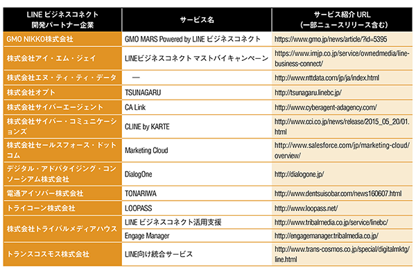 システム構築を自社で行うことも可能ではありますが、多くの企業においてはLINEが認定する開発パートナーに依頼するほうがいいでしょう。LINE ビジネスコネクト開発パートナーとは、利用企業がゼロからシステム構築する手間を省略するために、LINE ビジネスコネクトに対応したパッケージなどを開発している企業のことです。2016年8月現在で12社が開発パートナーとして認定され、企業のLINE ビジネスコネクト導入を支援しています。システムを構築し、その後も安定的な運用を行うためには、LINEの仕様について常に最新の情報を得て対応していくことが重要です。その意味でもすべてを自社で対応せずに開発パートナーに依頼することをおすすめします。もちろん企業ごとの事情で外部パートナーの活用が難しい場合や、自社でシステム構築と維持を行える体力のある企業においてはその限りではありません。各開発パートナーが支援できる得意領域は少しずつ異なりますので、目的に応じてパートナーを選定しましょう。