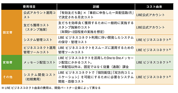 費用構造も把握しておきましょう。LINE ビジネスコネクトを活用する場合、費用は大きく固定費と変動費に分けて考えることができます。なおシステム開発費は初期費用であり、この中には含んでいません。大半の企業が採用しているAPI型公式アカウントで運用する場合で見ると、固定費としてはアカウント費と友だち獲得スタンプ費の2つが大きく、一方でOne to Oneのメッセージ配信費が変動費に該当します。
