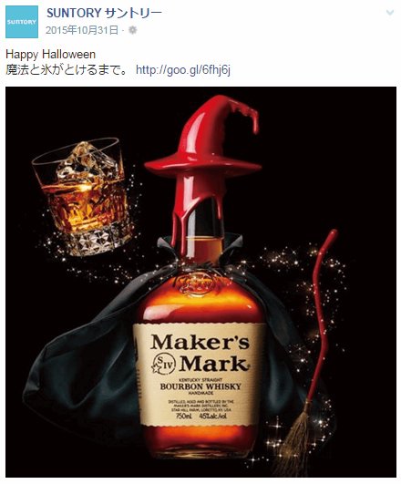 「ハロウィン」という季節のイベントをテーマに、自社商品(ウイスキー)に仮装させています。季節感とユーモアをかけ合わせた投稿です。