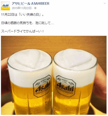 タイミングという点では、「記念日」をネタに投稿するのもいいでしょう。この事例は「11月22日(いい夫婦の日)」にあわせ、夫婦で乾杯している様子を投稿している、ユニークかつ温かい投稿です。