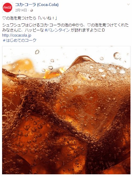 商品をテーマにしたクイズ投稿です。商品(コーラ)のはじける泡のなかで、ハートマークの泡を見つけてもらい、わかったら「いいね!」で答えてもらっています。