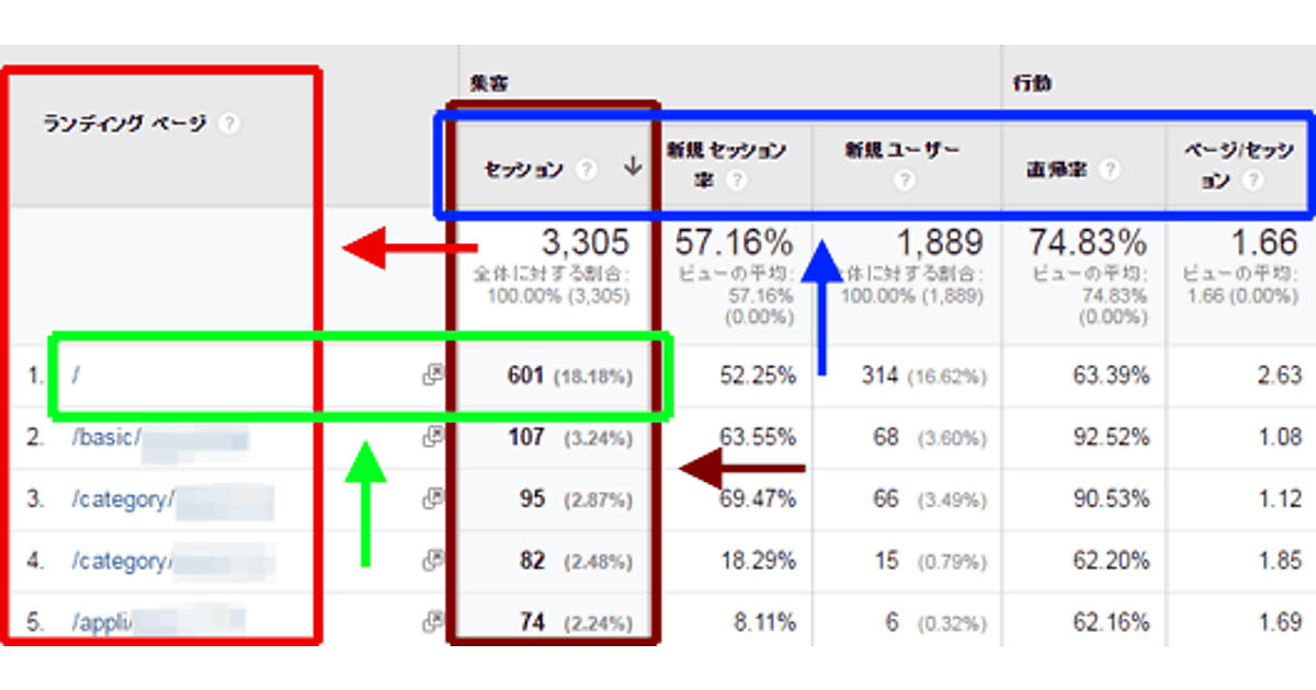 一覧表では、ランディングページ別に(図2赤枠部分)、セッション数や直帰率などの各種指標)を見ていくことができる(図2青枠部分。
