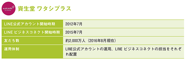 LINE ビジネスコネクトの利用は2015年8月に開始しました。そもそもワタシプラスが「One to Oneでお客さまとのリレーション強化」をコンセプトとしていることもあり、LINEでもOne to Oneコミュニケーションを行いたいという要望は強かったとのことで、マルチチャネルで顧客とOne to Oneの関係を作っていくCRMシステムの一環として、LINE ビジネスコネクトの活用を決定したとのことです。