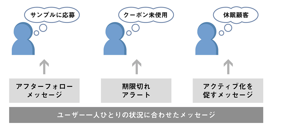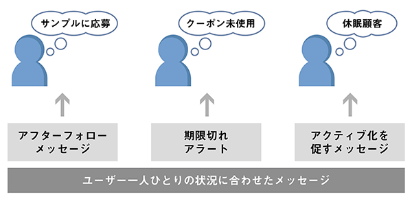 一人ひとりの状況に応じたメッセージを配信することで、購入につながりやすくなりますね。