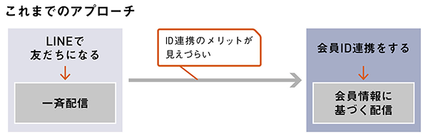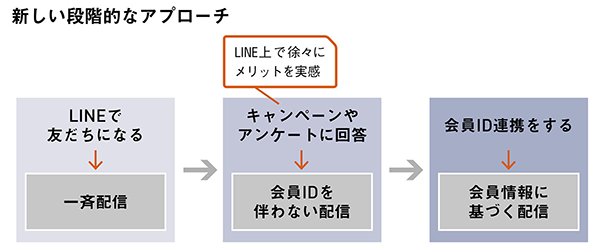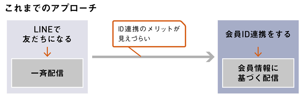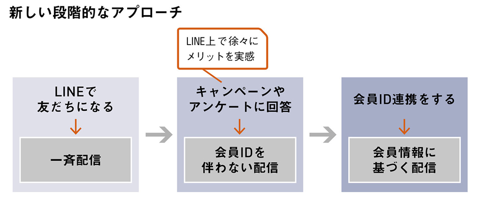 ワタシプラスIDとの連携のためには、一斉配信のメッセージからユーザーにワタシプラスWebサイトを訪問してもらい、会員登録やログインをしてもらう必要がありますが、この道のりが少し遠いと認識しているとのことです。ID連携をしてくれた友だちは、会員データに基づいたよりきめ細かいアプローチが可能となるなど、価値の高さは間違いないのですが、そこに至るハードルの高さも無視できません。そのため、最初からワタシプラスIDとの紐付けを促すのではなく、まずはキャンペーンへの反応やアンケートへの回答をもとに情報を配信し、その有用性を感じてもらうことからOne to Oneコミュニケーションを開始する、いわば「段階的にユーザーの温度を高めていくアプローチ」(飯田氏)を検討中です。