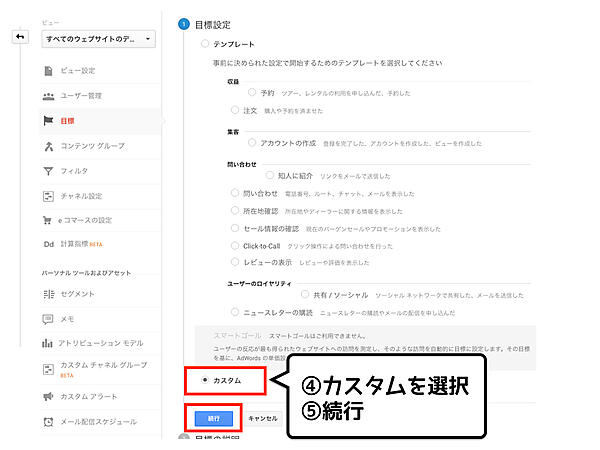 ゴールのページが決まったら、Google アナリティクスの「目標」という機能を使い設定します。