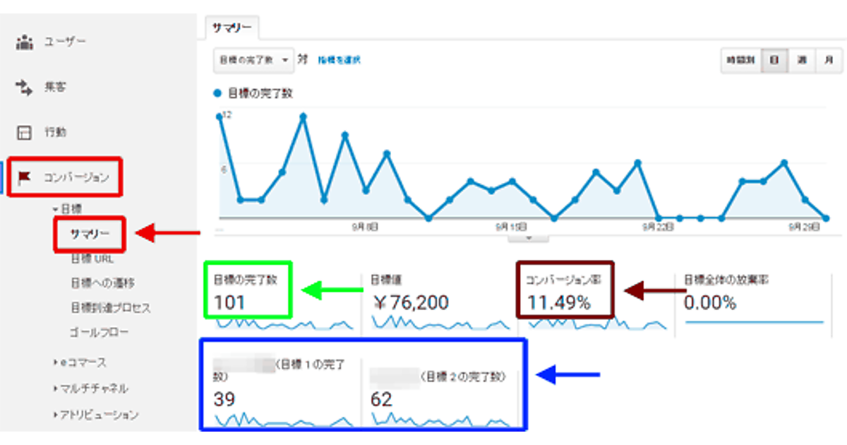 そして、それらすべての目標のコンバージョン数の合計であるのがその上の「目標の完了数」だ(図2緑枠部分)。図2の例では目標1のコンバージョン数が39、目標2のそれが62なので、その合計である101が「目標の完了数」の数値となっていることがわかるだろう(図2緑枠部分)。
