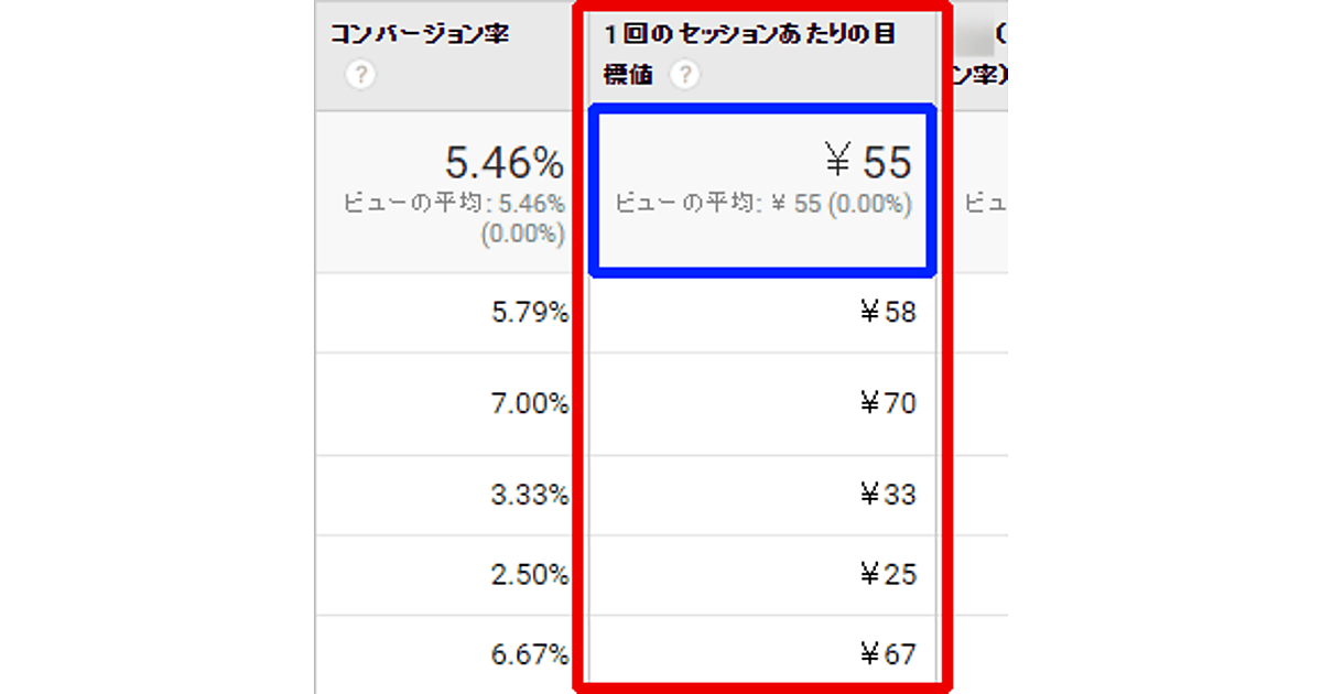 目標セットを選択すると、データ一覧表示部が切り替わる(図4)。データ一覧表示部の左から4列目が「1回のセッションあたりの目標値」だ(図4赤枠部分)。一番上の行の数値「¥55」がサイト全体における1セッション(訪問)が生んだ金額価値で(図4青枠部分)、その下に続く数値が「参照元/メディア」にある項目別の1セッション(訪問)が生んだ金額価値だ。